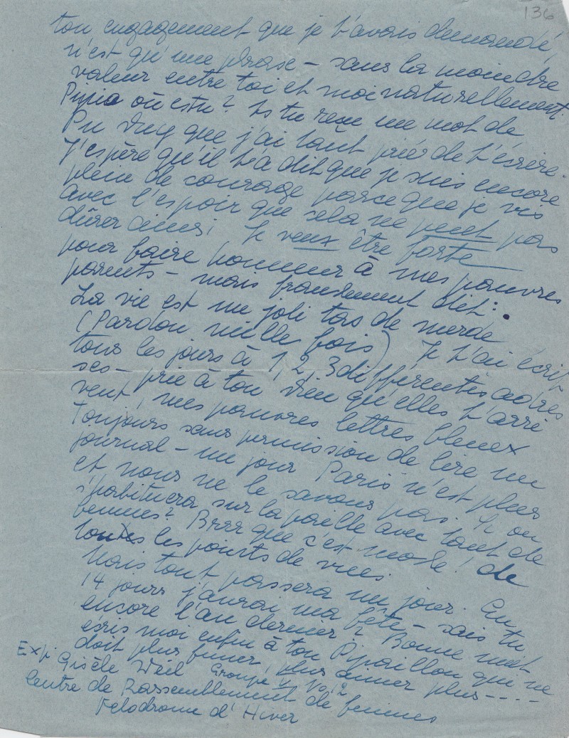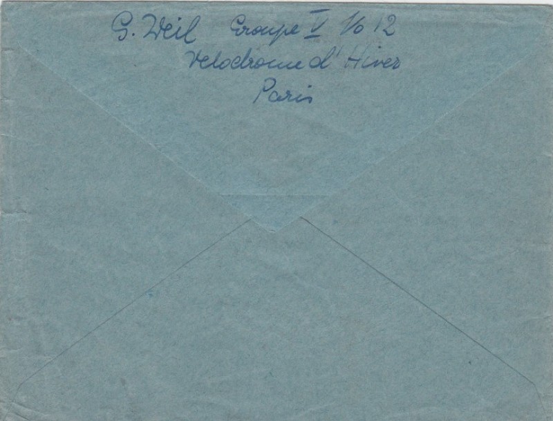 La lettre (en signature et au revers de l'enveloppe) confirme la constitution de groupes de femmes, à l'intérieur du Vel'd'Hiv'. Gisèle Weil fait partie du cinquième. Le numéro 12 se réfère-t-il directement à elle, ou - ce qui est probable, à un sous-ensemble?